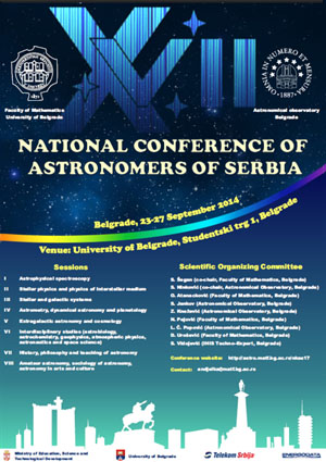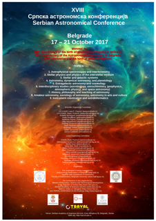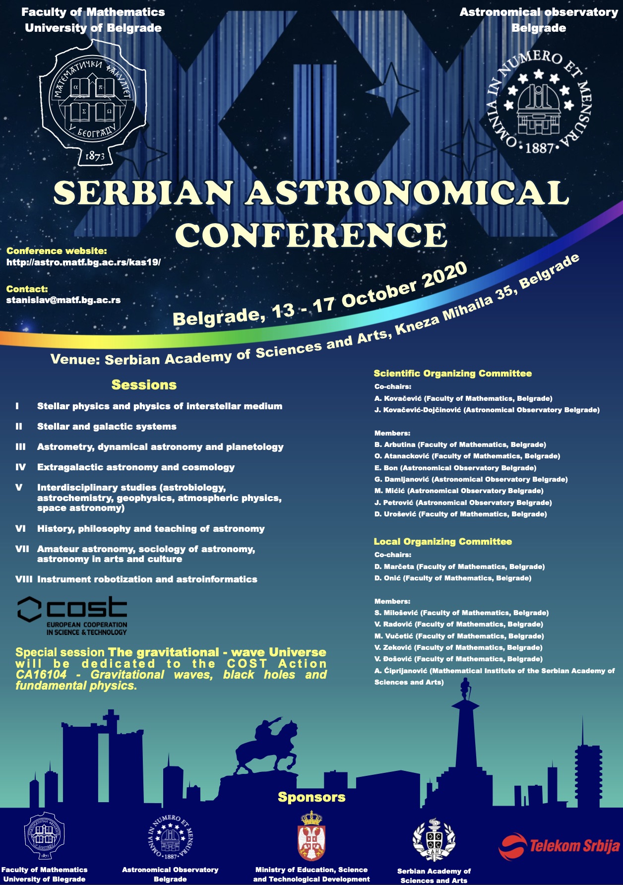 2 Astrophysical Instrumentation 3 Solar physics, stellar physics and physics of the interstellar medium 4 Stellar and galactic systems 5 Extragalactic astronomy and cosmology 6 Interdisciplinary studies (astroinformatics, astrobiology, astrochemistry, geophysics, astronautics and space science) 7 History of astronomy, astronomical education and outreach Special session: The first year of Vera C. Rubin Observatory operations Conference sessions will include: invited talks presented by domestic and foreign lecturers, presentations of doctoral and master degree theses that have been completed since the last conference, contributed talks, progress reports and flash talks (2-3min). Contributions presented at the Conference will be published in the Conference proceedings. All further information will be given through Announcements. Contact address: XXIth Serbian Astronomical Conference Serbian Astronomical Conference is organized every three years, alternately by